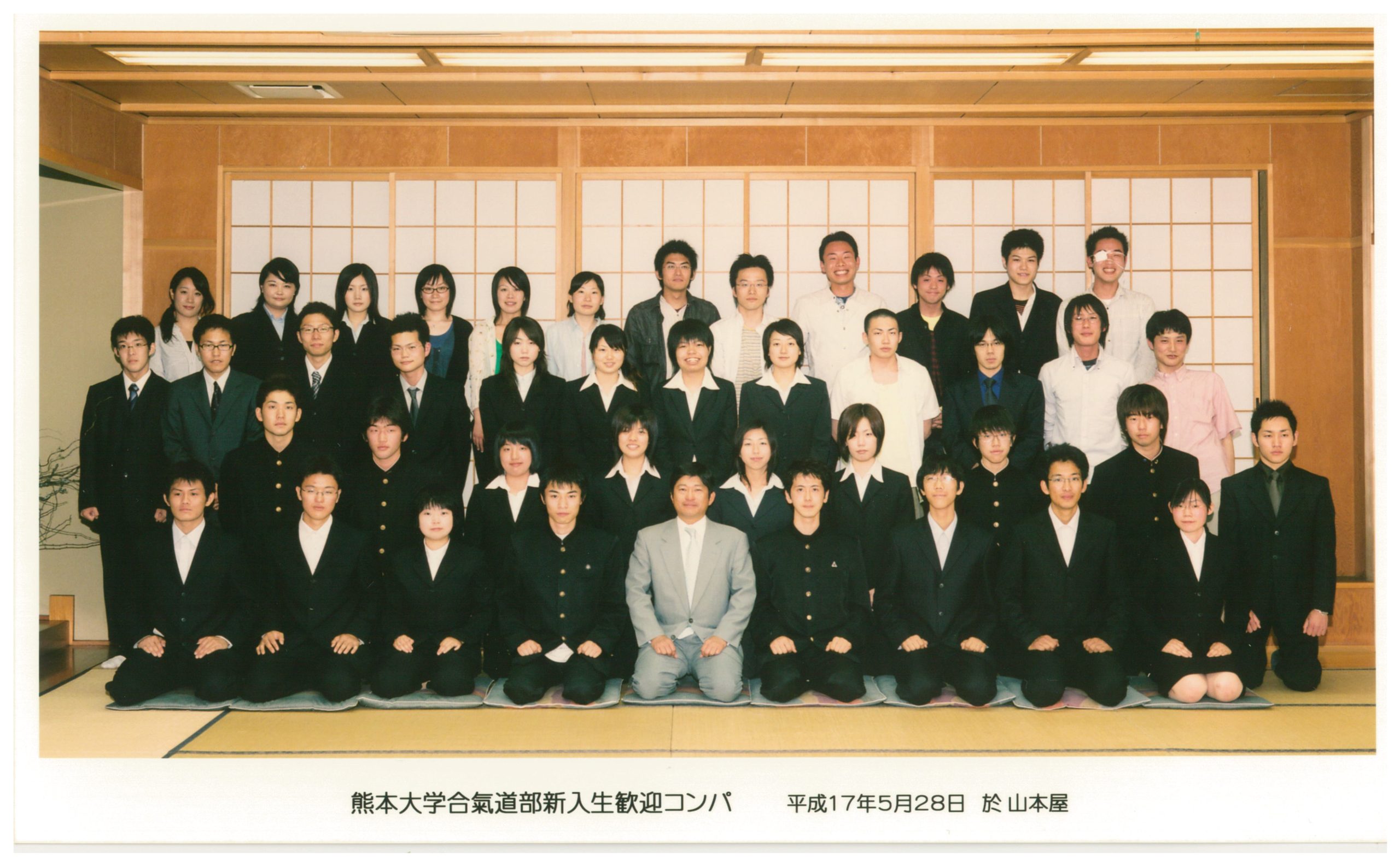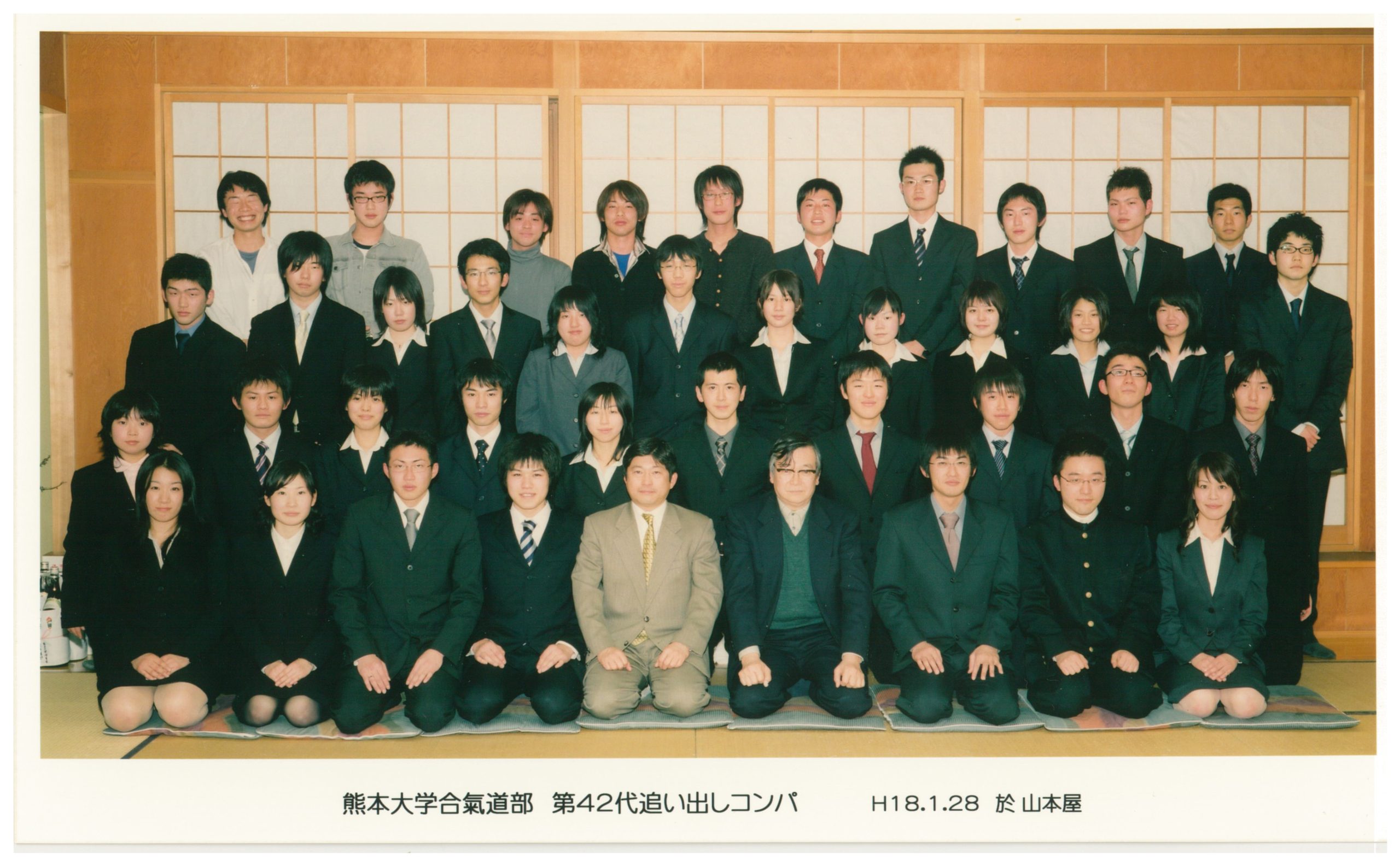 2005年(平成17年度) 43代-2005年(平成17年度) 部員名簿 主将 友永 泰輔 副将・OB連絡担当 池上 泰司 統制 末永 奈央子 主務 平石 遼太 渉外 津曲 ともみ 企画 三丸 慶治 会計 濱口 三穂 万生館連絡 松崎 洋行 2005年(平成17年度)新歓コンパ 於:山本屋 2005年(平成17年度)阿蘇遠歩 2005年(平成17年度)阿蘇夏合宿 2005年(平成17年度)演武会 於:産業文化会館 2005年(平成17年度)演武会記念品 2005年(平成17年度)追い出しコンパ 於:山本屋